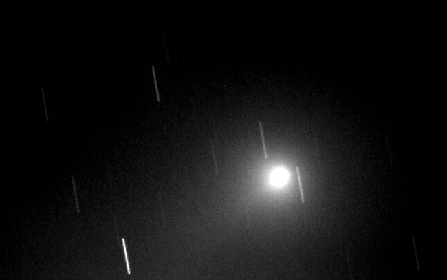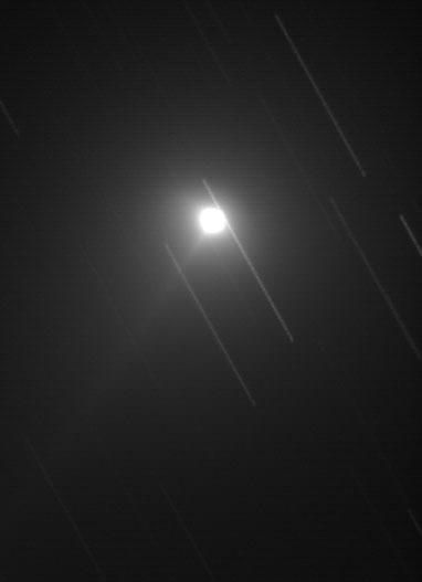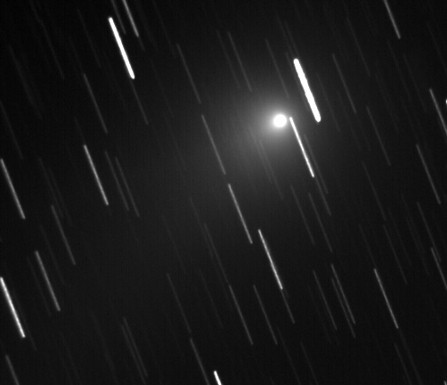 July 8, 2001. This picture is the combination of 20 fifteen second images, unguided, combined using AIP4WIN. No other image processing performed, other than a small histogram stretch. The motion of the comet is toward the bottom of the picture (parallel with the star trails), and faint hints of the tail can be seen emanating from the coma at about 45 degrees toward the lower left. Unsteady skies, taken at dawn (literally, with lots of sky glow) on the morning of 7/8/01, at -18C.
