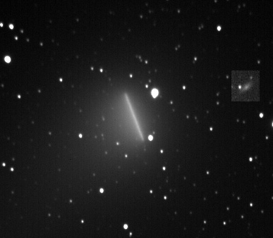 July 25, 2001. These pictures are the combination of 30 one-minute images, guiding on a star, combined using AIP4WIN. No other image processing performed, other than a small histogram stretch. The picture on the left shows the images stacked, aligned on the comet. Again, the motion of the comet is toward the lower right (parallel with the star trails). This time, the tail is much less evident, emanating from the coma toward the lower left. The comet lost another magnitude and-a-half of brightness between July 13 and July 25, from about 5.2 to about 6.6, and it is much farther away. All images taken at -15C. The picture on the right was made by combining the same images, aligned on the stars, to show the motion of the comet during the time I was imaging. Also, note the galaxy in the field; the highlighted fuzzy object about a third of the way down near the right edge (in the box) is CGCG 449-14, a magnitude 15.3 spiral galaxy (thank you Software Bisque for the ability of CCDSoft and The Sky to link, so we can find information like that). Another oddity I noticed in the image is the odd shaped star to the right of the comet trail; why, I wondered, was this one oblong, when the others were reasonably round? The answer, it turns out (again thanks to Image Link), is that it is a double star (GSC1659:79, a pair of 10th magnitude stars).