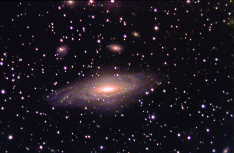 Deer Lick Group: The dominant galaxy is NGC7331, a magnitude 10.3 spiral galaxy estimated to be close to 50 million light years away. It is thought that this is similar to what our galaxy would look like from a like distance and angle. It has a radius of about 32,000 light years. Note there are at least five other galaxies in the picture: MCGC-49-44, a magnitude 15.6 spiral galaxy, in the lower right corner; glowing at the top of the picture, about ¾ of the way to the left edge, is NGC7340, a magnitude 14.7 spiral Galaxy; between this galaxy and NGC7331, toward the left, is NGC7337, a magnitude 15.2 barred-spiral galaxy; to its right is NGC7335, a magnitude 14.5 lenticular galaxy, and above and to the right of NGC7335 is NGC7336, a magnitude 17 spiral galaxy. This group apparently was given this odd name "in commemoration of one of the finest nights of viewing EVER, at Deer Lick Gap, just off the Blue Ridge Parkway, in the NC mountains," by persons unnamed.