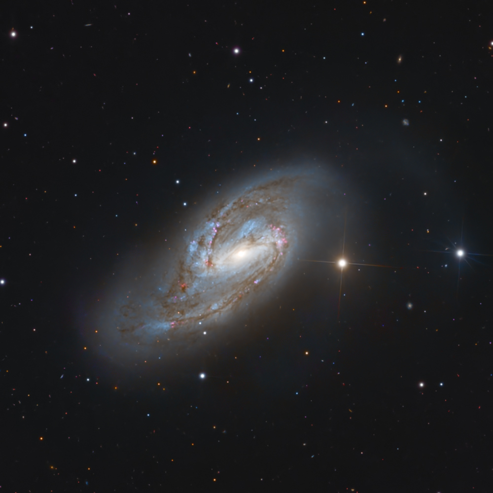 M66 is a large spiral galaxy, with a weak bar, presenting to us at a significant angle (causing the elliptical appearance). It is located near two other large galaxies M65 and