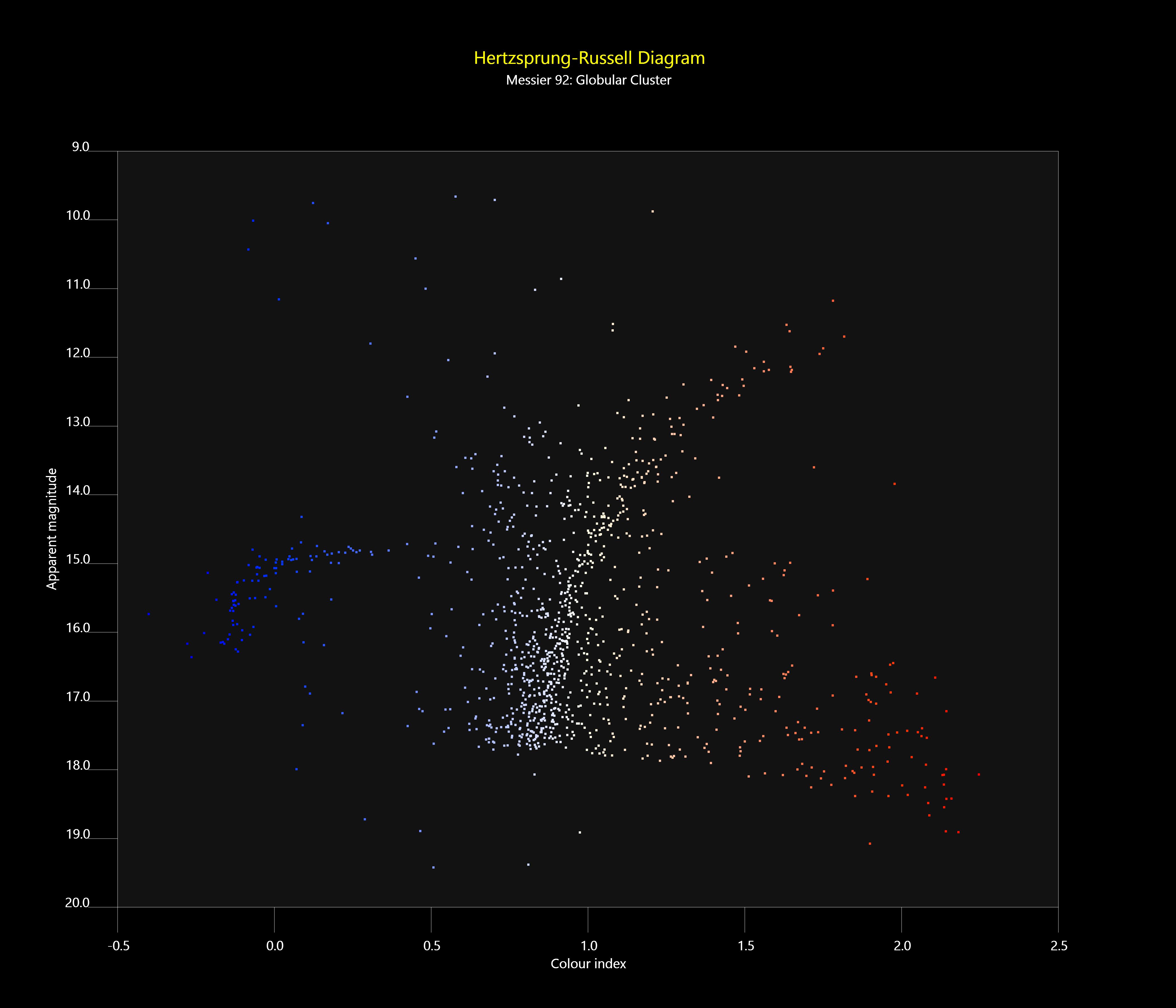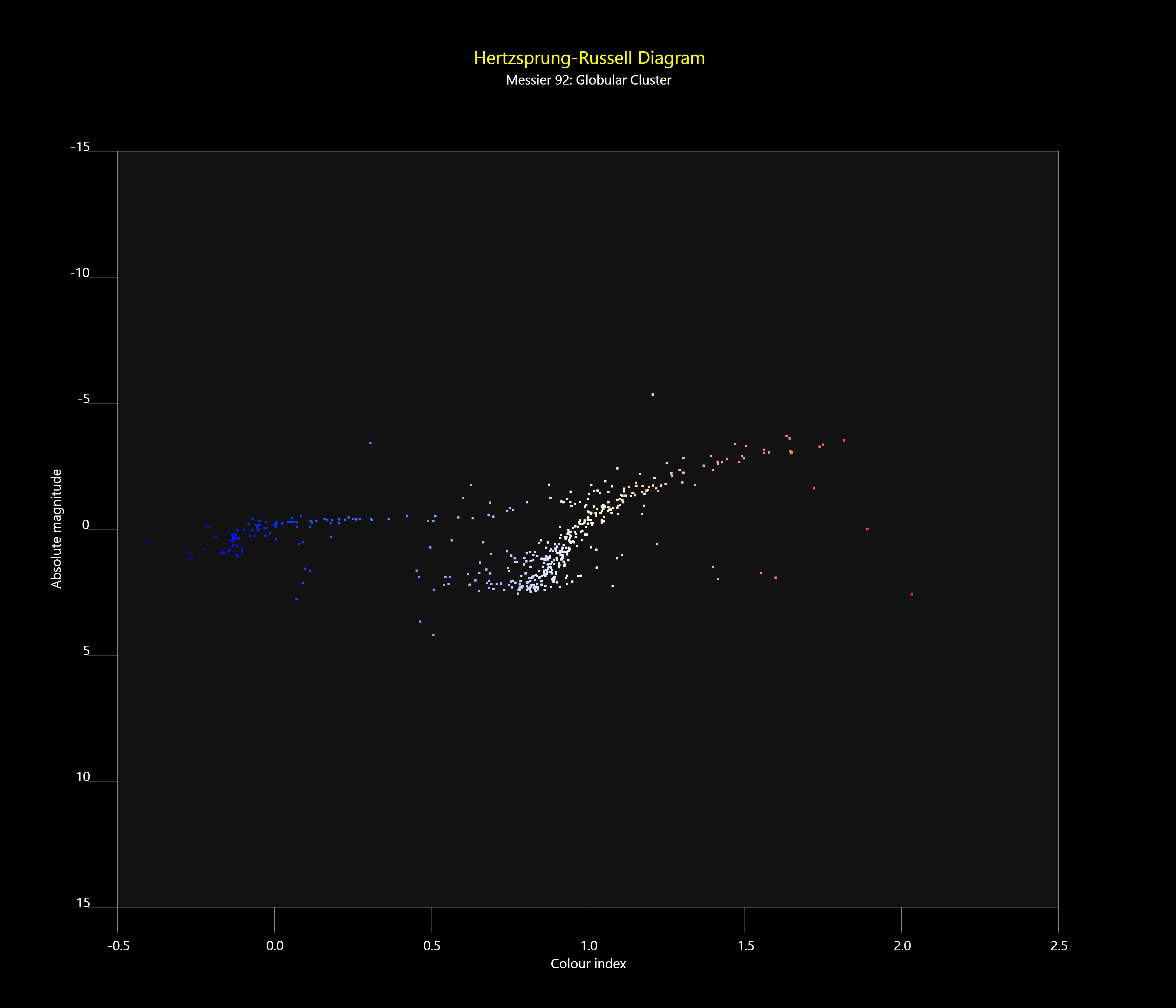 Because all the stars in a globular cluster are essentially the same distance from us (relative to the absolute distance from us), it is interesting to create a Hertzsprung-Russell diagram ("HR Diagram") of