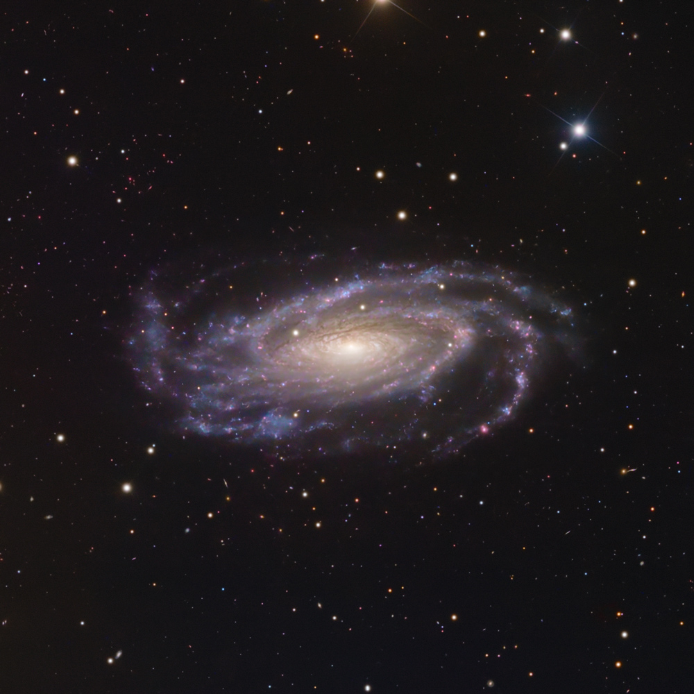 The pink regions (of which there are many) are star-forming regions, and the blue arms contain hot young stars. The galaxy is somewhat deformed (note, for instance, that the spiral arms on