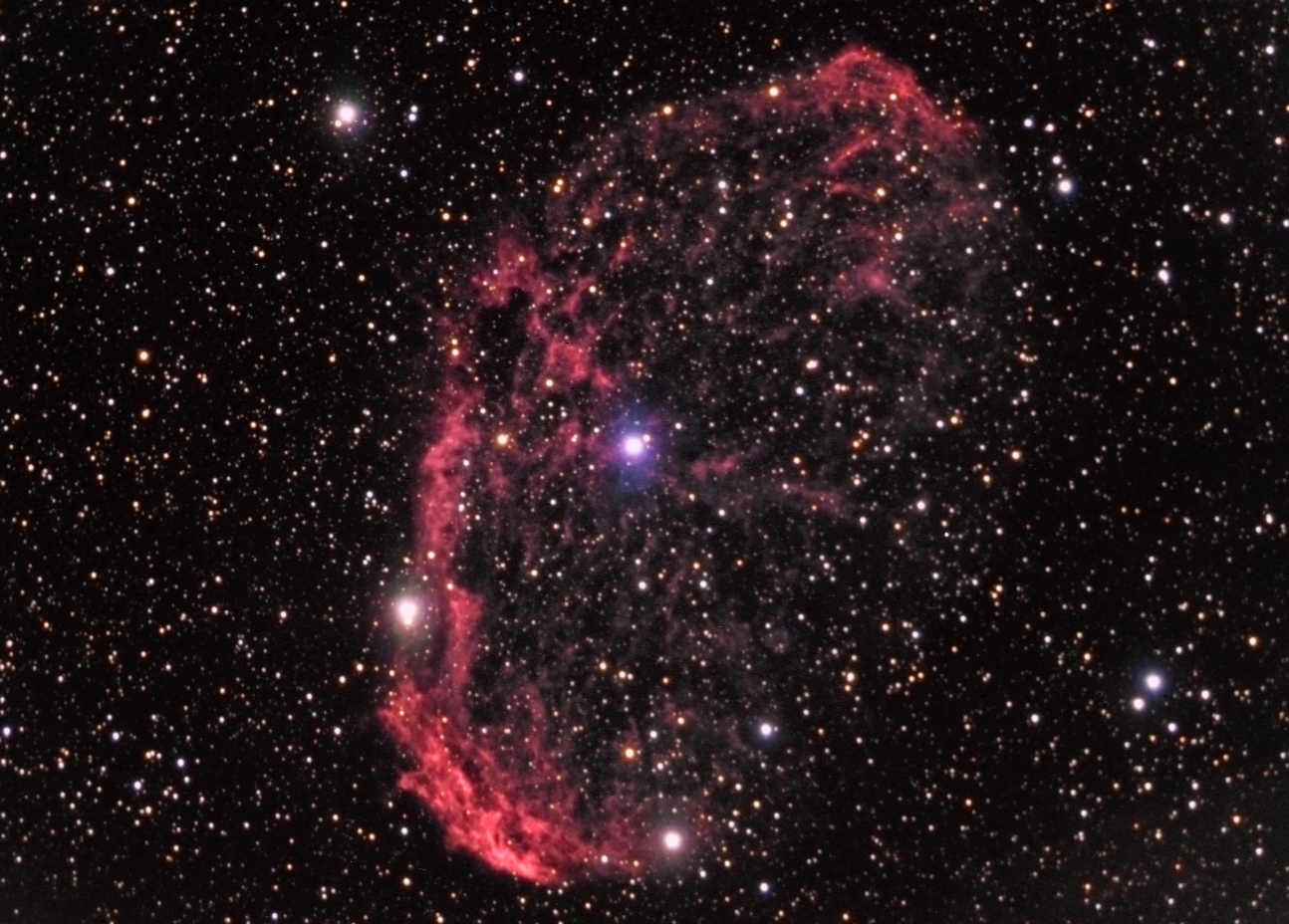 NGC6888: This is a nebula formed by the action of the central star (the huge blue star at the center of the nebula) expelling its outer gases as it begins the process of dying. At the first stages of its death throes, the star became a red super-giant, and gently puffed out its outer layers, approximately 250,000 years ago. Then it became a type of star called a Wolf-Rayet, a rare, short-lived super-hot star, which started expelling gas at a very high rate (an amount of mass equal to our sun's entire mass each 10,000 years), and at very high speeds, which caused the expelled gas to assume something of a shell shape. It is thought that the central star will become a supernova in the next million years. The nebula is about 4,700 light years from Earth and is roughly 16 by 25 light years in dimension.