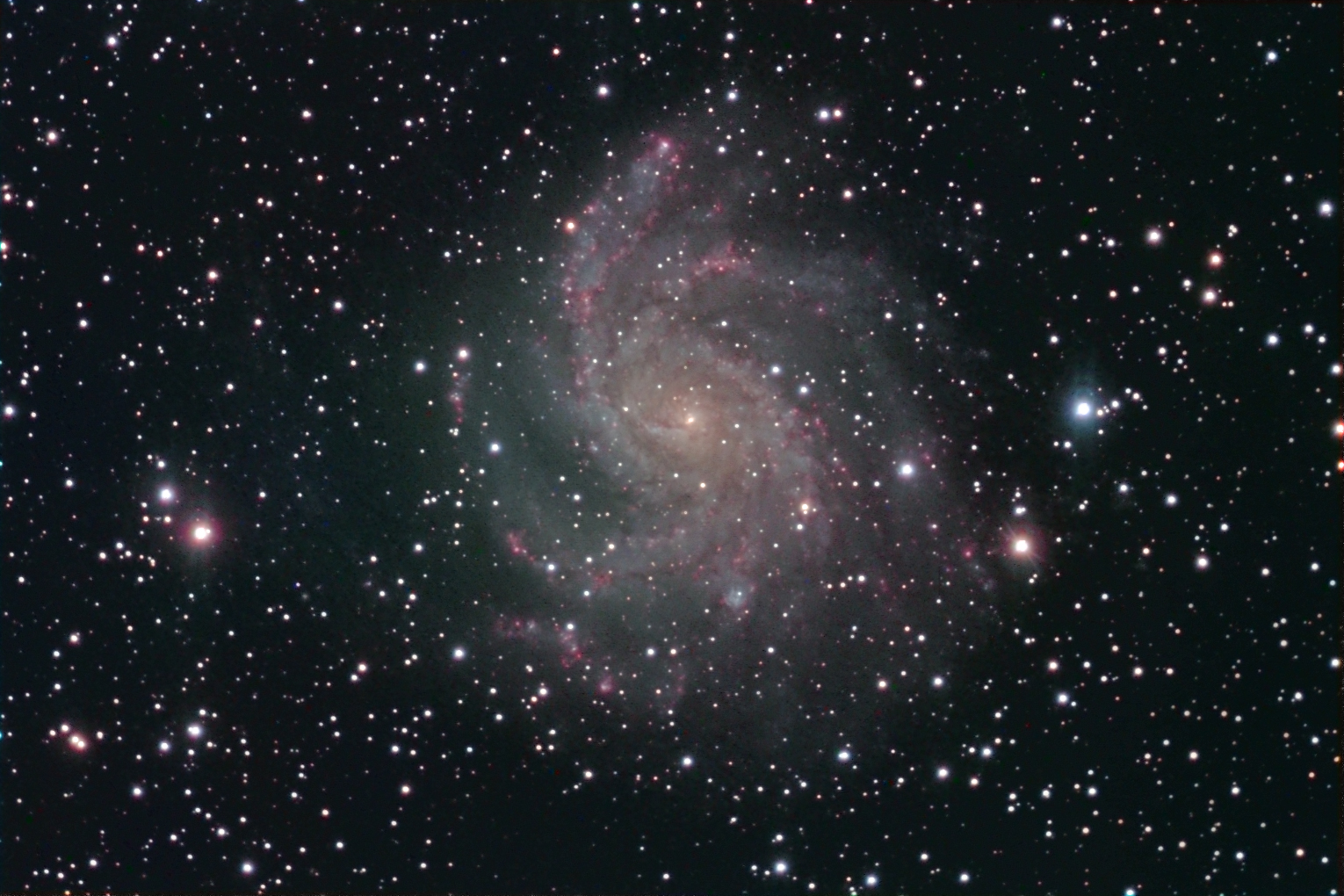 NGC6946: This is a very dim, 10th magnitude galaxy in Cepheus toward Cygnus, approximately ten million light years from Earth. Looking from the bright core outward along the spiral arms, the galaxy's colors show a change from the yellowish light of old stars in the galaxy's center to young blue star clusters and reddish star forming regions. NGC 6946 is also bright in infrared light and rich in gas and dust, exhibiting a high star birth and death rate. During the 20th century, at least six supernovae, the death explosions of massive stars, were discovered in NGC 6946. A small barred structure is just visible at the galaxy's core.