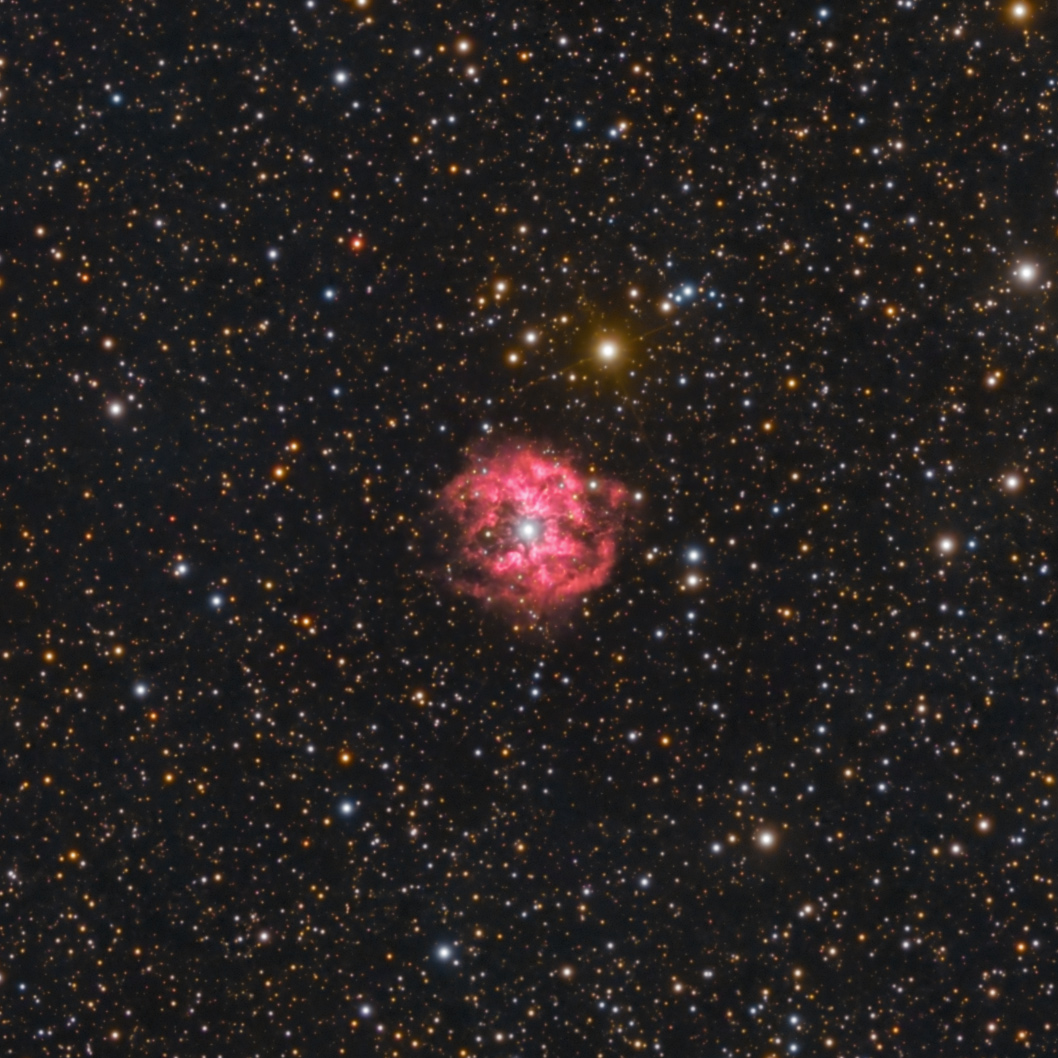 Click on the image to toggle between a color version and a pure Ha version. Normally, pure Ha does not make an interesting version of a tiny nebula, but I think it does