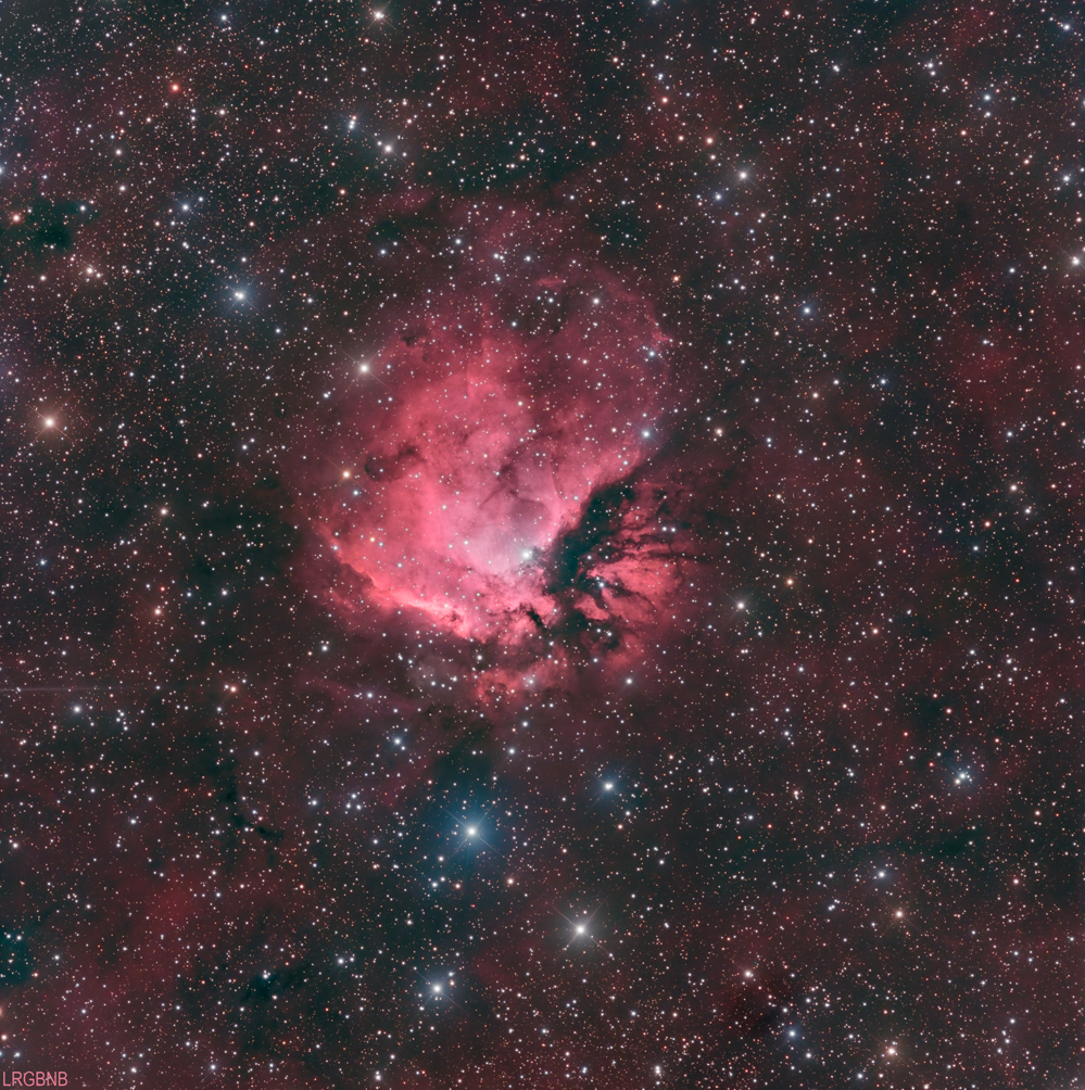 (ii) A true-color version (the second photo in the stack, labeled "LRGB"), without using any narrow band data (all color is derived from data collected through red, green and blue filters), as a comparison to the result when loaded with NB data. I always like the rich colors (especially in the stars) that this method exhibits but the larger stars than the LRGBNB version, together with more of them, can overpower the nebula; );