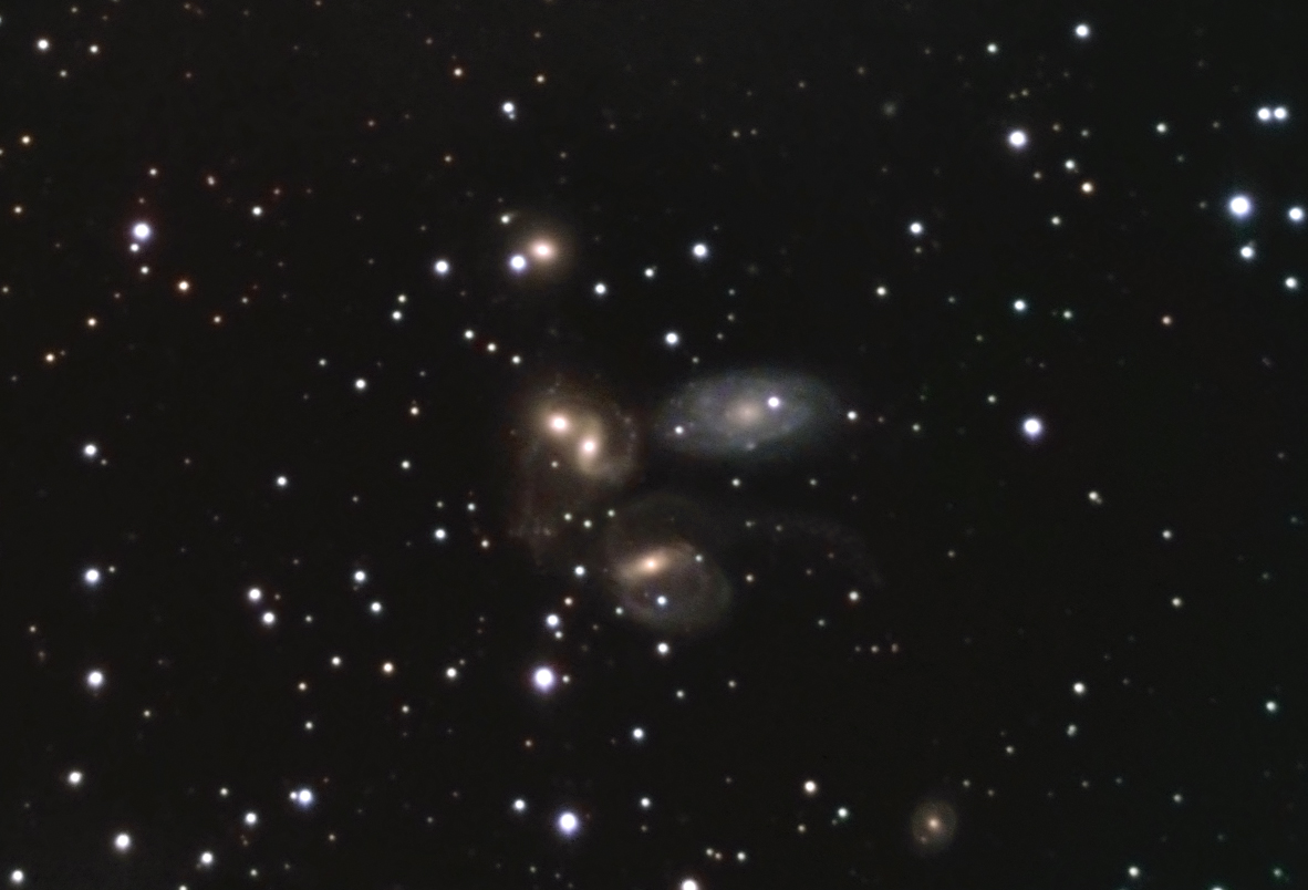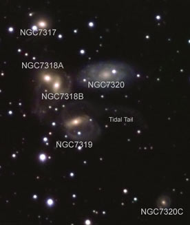 There are six galaxies plainly visible in this image, ranging in brightness from the very faint NGC7318A (magnitude 13.1) to the extremely faint NGC7320C (magnitude 16.57); the five in the middle are commonly known as Stephan's Quintet. Four of those galaxies show essentially the same redshift, suggesting that they are at the same distance from us, approximately 270 million light years. The larger bluish spiral above and right of center of the group, NGC7320, has a much smaller redshift than the others, suggesting that it is much closer to us than the others, probably a foreground object which happens to lie along the line of sight to the more distant galaxies, about 35 million light years away from us. Of the four distant galaxies in the group, three seem to be colliding, showing serious distortions due to gravitational tidal forces. The fourth, NGC7317, above the others, is a normal appearing elliptical galaxy. Another collision that wreaked havoc was triggered by a galaxy that is no longer part of the group. NGC 7320C, at the bottom of the image, plowed through the quintet several hundred million years ago, pulling out the 100,000 light-year-long tidal tail of gaseous debris from NGC 7319 and adding gaseous fuel to the northern starburst region. NGC 7320C is now 460,000 light-years away from the rest of the carnage. The clusters in NGC 7319's streaming tail are 10 million to 500 million years old and may have formed at the time of the collision. |