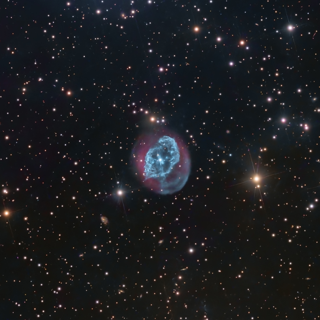 This pretty nebula is thought to be about 5000 light years from us, and covers about 2.5 arcminutes of the sky; at that distance, Abell 78 is about 3.6 light years across.