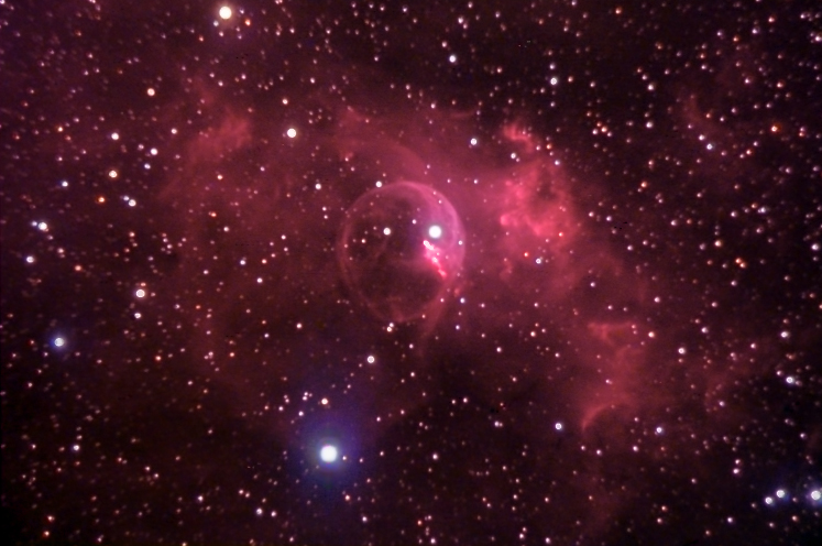 M82: The Bubble Nebula is formed around a massive bright blue star, which is emitting a fast stellar wind of ionized gas. As fast moving gas expands off the central star, it pushes surrounding sparse gas into a shell. The energetic starlight then ionizes the shell, causing it to glow. The nebula, also known as NGC 7635, is visually located on the edge of the constellation Cassiopeia. The Bubble Nebula is thought to be a rare example of a very massive star, with an extremely strong stellar wind, located within a gas cloud. It can be seen that this outward wind results in an expanding shock-wave which forms this "bubble" in space. The "bubble" itself is estimated to be about 10 light years across, more than twice the distance from the Sun to the nearest star; estimates vary regarding its distance from earth, with 7100 light years being the most common figure given.