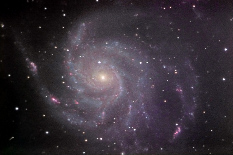 M101: A striking example of the spiral galaxy (like our galaxy, the Milky Way) is M101, shown above, whose relatively close distance of about 22 million light years allow it to be studied in some detail. It is located in Ursa Major (of which the Big Dipper is a part), near the tip of the handle of the Big Dipper. Recent evidence indicates that a close gravitational interaction with a neighboring galaxy created waves of high mass and condensed gas which continue to circle the galaxy. These waves compress existing gas and cause star formation. One result is that M101 has several extremely bright star-forming regions (called HII regions) spread across its spiral arms (which appear as pinkish blobs in the picture). M101 is so large that its immense gravity distorts smaller nearby galaxies.