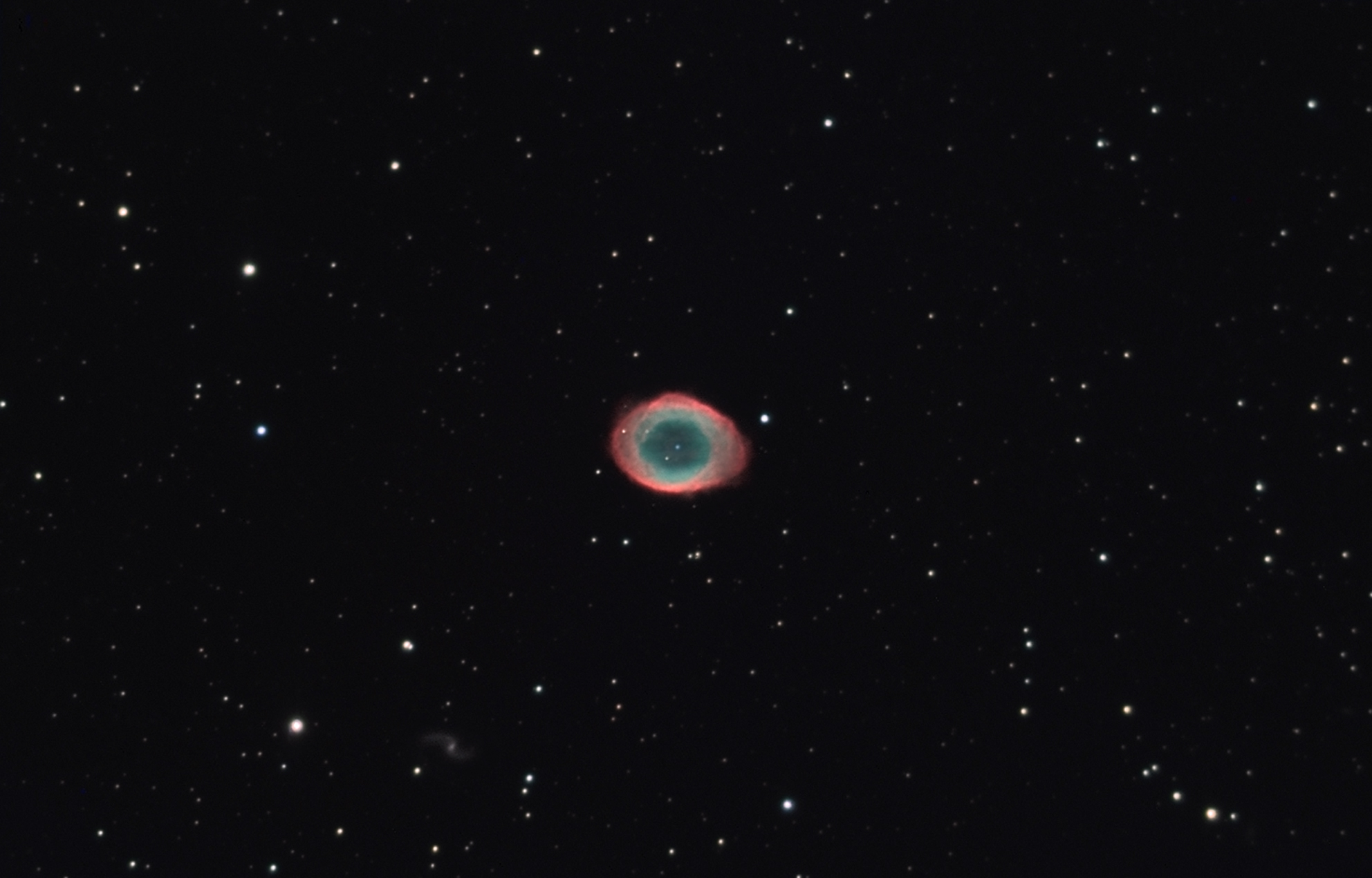M57 (and IC1296):  Stars with mass similar to that of our Sun throw off their outer gasses after fusion has stopped in their core. One of the most famous, and easily found, of these "planetary nebulae" is the Ring Nebula, M57. The appearance as a ring is really an illusion of projection - it is believed that the nebula is actually shaped like a hour-glass (we are seeing it from the end). The bluish star at the center of the nebula is the old core of the star, now evolving into a white dwarf.  Nebulae of this type are called "planetary nebulae," because in older smaller scopes, they looked like small, blurry planets.  It is about 2000 light years from Earth and is roughly one light year wide; it is visually in the constellation Lyra.    IC1296, a magnitude 15 spiral galaxy, can be seen to the lower left of the nebula.