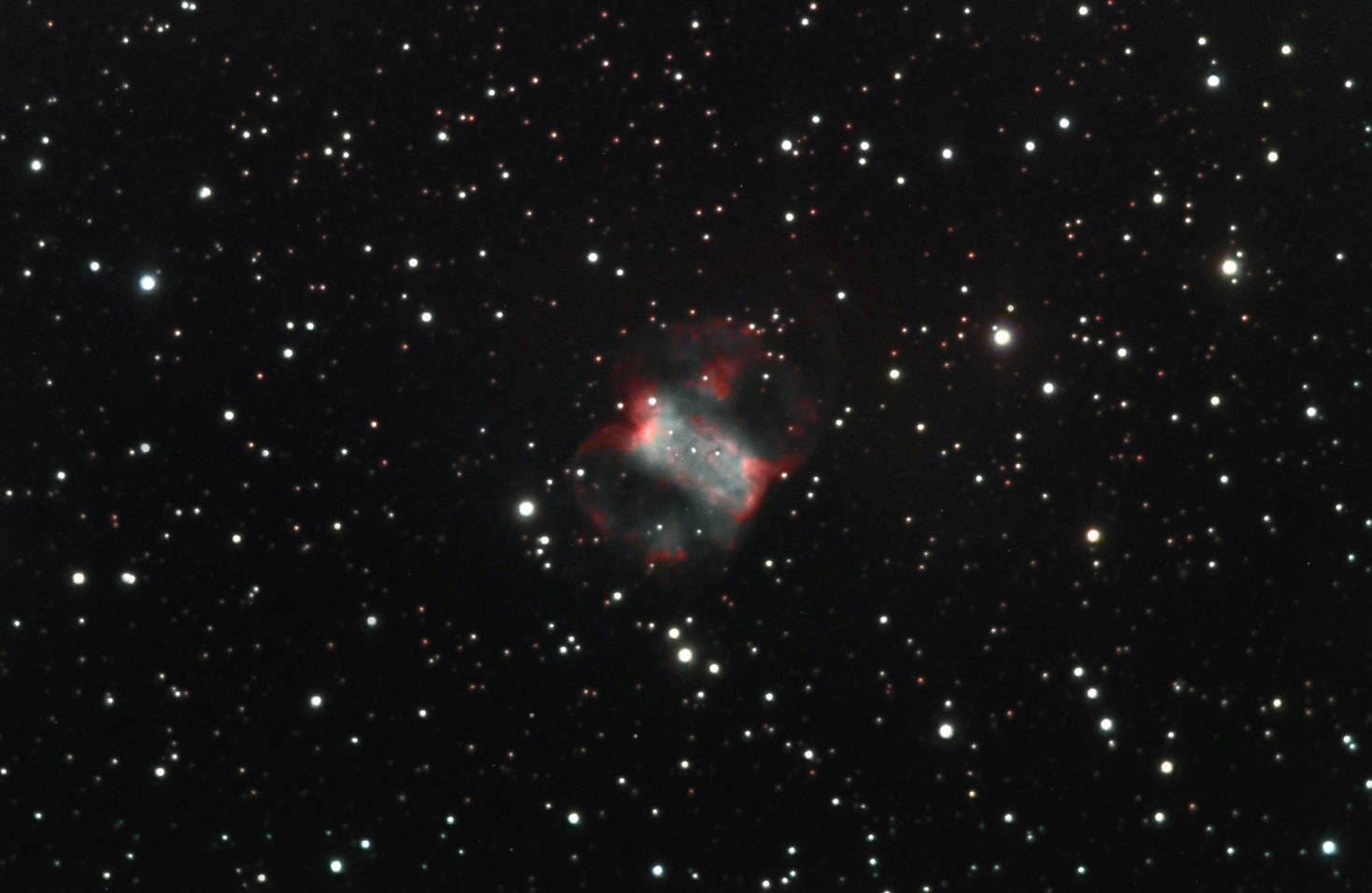 M27: M76, also known as the Little Dumbbell Nebula because of its vague resemblance to the much larger M27 (the Dumbbell Nebula), is a planetary nebula, the type of nebula which it is generally thought our Sun will produce as nuclear fusion slows and then dies in its core, and it expels its outer layers of gas. Unlike M27, most of M76 is quite dim, which presents a challenge both in taking the image and in processing it. M76 appears about 4 arcminutes across (including the faint parts). Its distance from Earth is not known with any precision, with estimates ranging from 1,000 to 15,000 light years; 3,400 light years is perhaps the most common estimate.