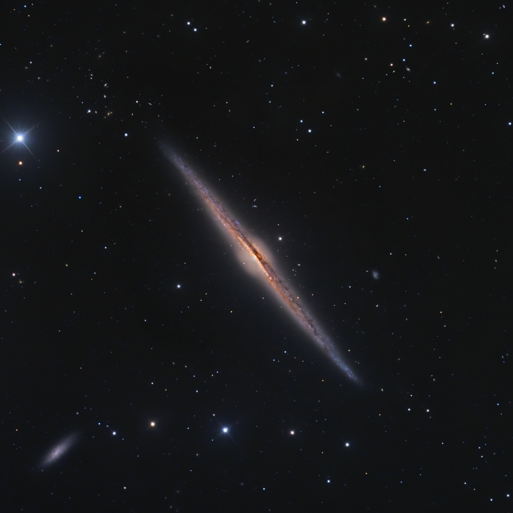 NGC 4565 is a very large spiral galaxy, presenting to us almost edge-on. NGC 4565 is estimated to be about 40 million light years away from us (relatively close, as cosmic distances go, for