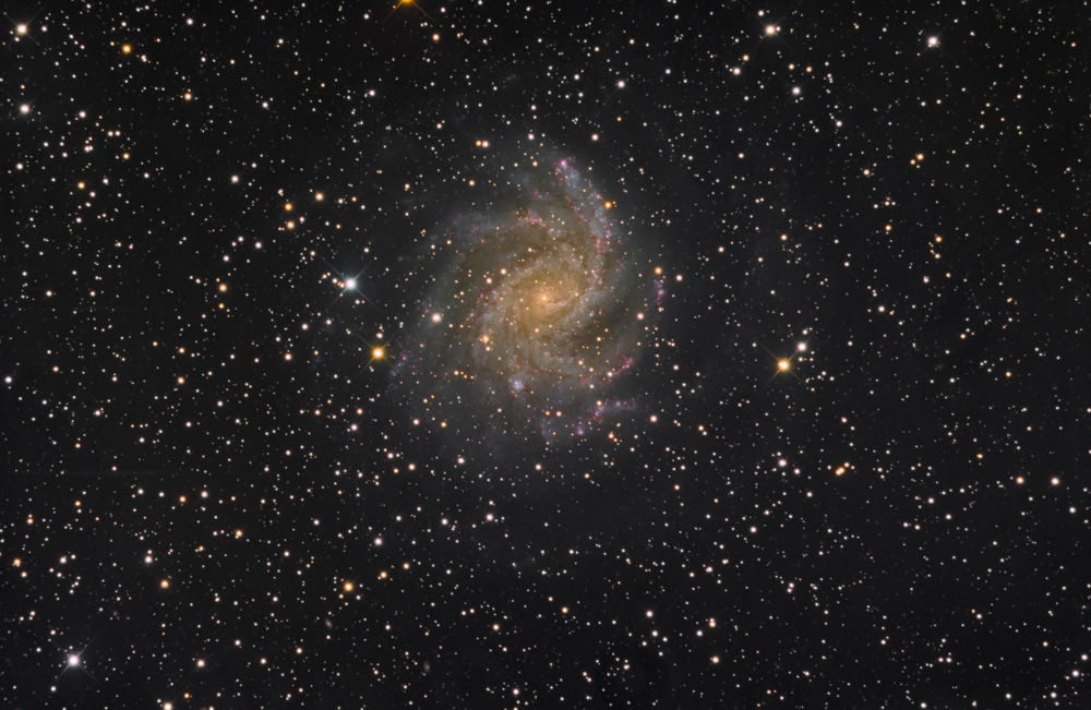 NGC6946: This is a very dim, 10th magnitude galaxy in Cepheus toward Cygnus, approximately ten million light years from Earth. Looking from the bright core outward along the spiral arms, the galaxy's colors show a change from the yellowish light of old stars in the galaxy's center to young blue star clusters and reddish star forming regions. NGC 6946 is also bright in infrared light and rich in gas and dust, exhibiting a high star birth and death rate. During the 20th century, at least six supernovae, the death explosions of massive stars, were discovered in NGC 6946. A small barred structure is just visible at the galaxy's core.