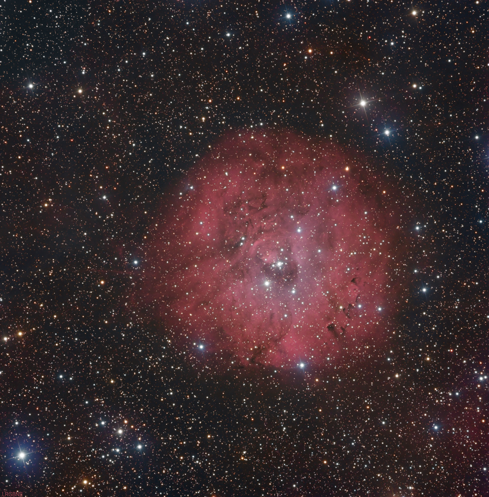 Sharpless 170 is a very faint emission nebula (the faintness is most evident in the version labeled "LRGB"), with an associated open star cluster. As is the case with
