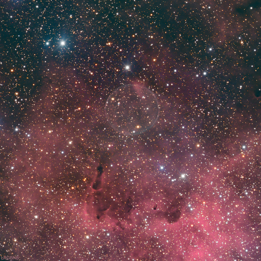this nebula is--it's practically invisible when no narrow-band emissions are added; no wonder it wasn't discovered until narrow-band imaging became popular. Even then, it was discovered